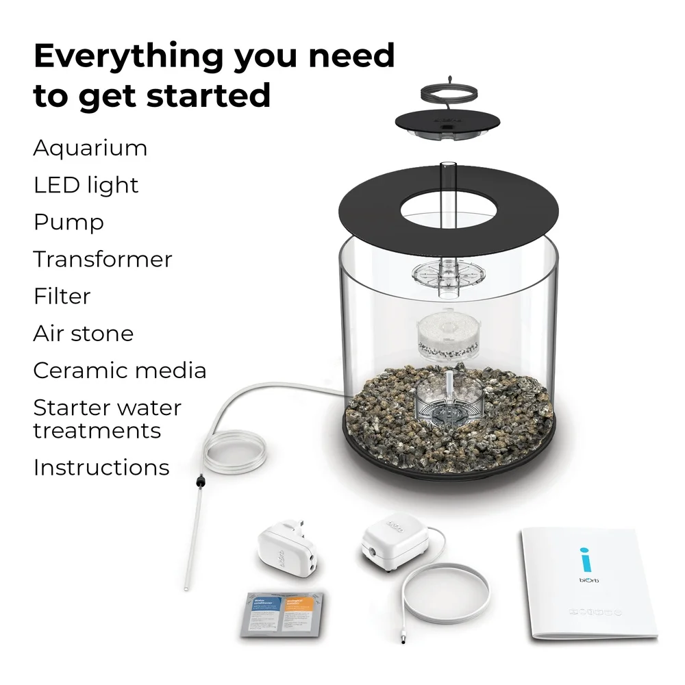 Includes: Aquarium, air pump, LED lighting, transformer, water treatments, air stone, filter cartridge, ceramic media, and instruction manual