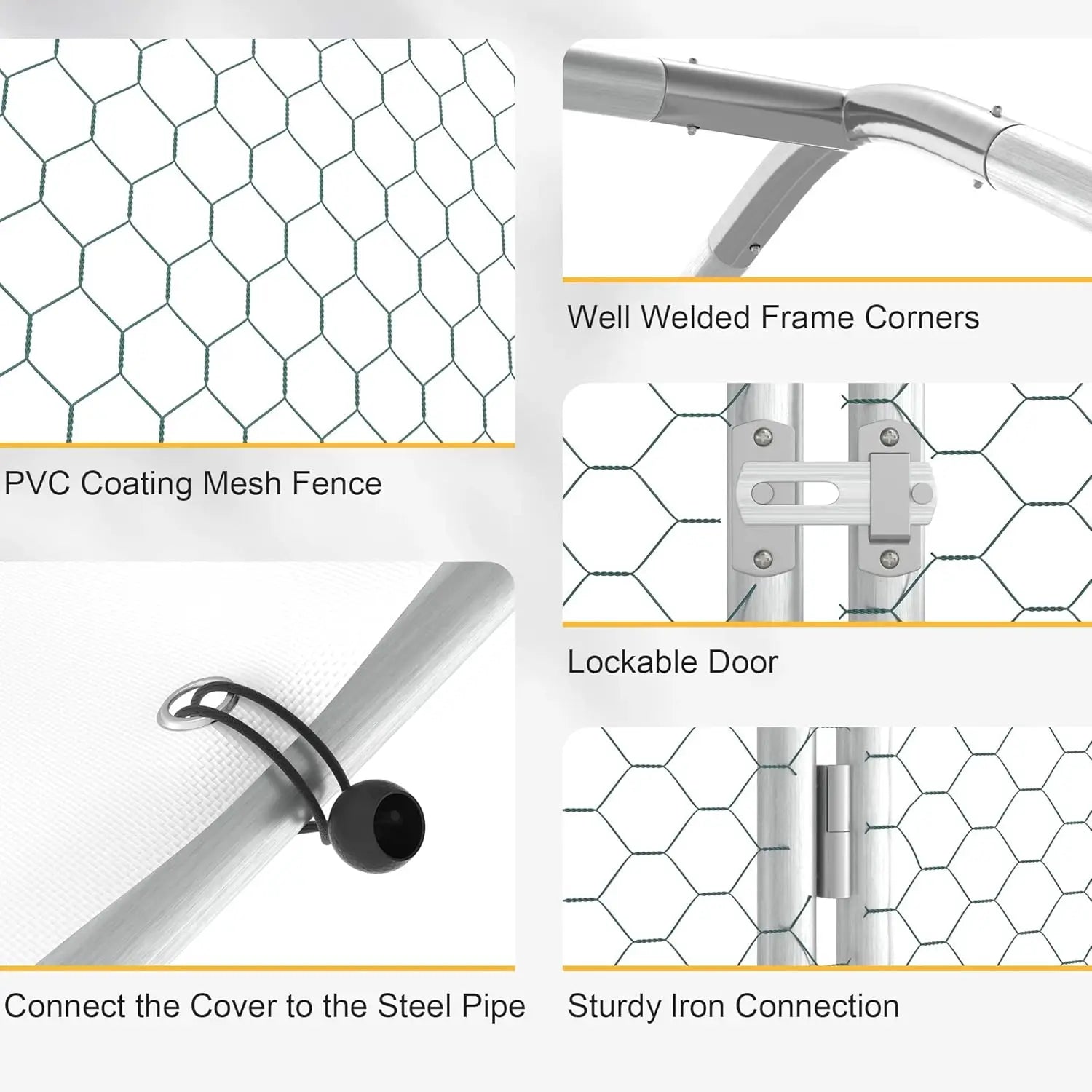 - Heavy-duty iron construction resists rust and weather, while welded mesh prevents escapes and keeps predators out, even when you need to hose down the run.
