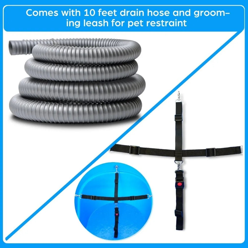 - Drain and restraint features include a 10-foot drain hose and a grooming leash to simplify rinsing and controlling your pet from start to finish.